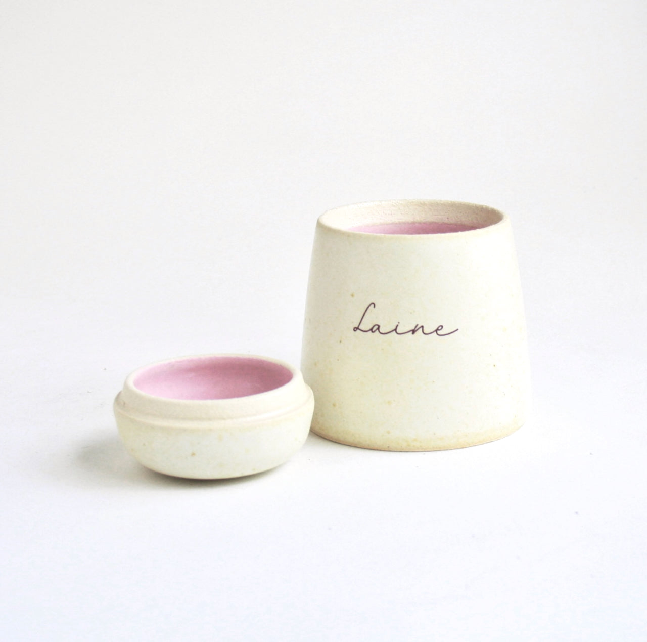 Handmade urn with custom pink interior and decal name.  Made with love for Laine. Thank you Olivia 🩷