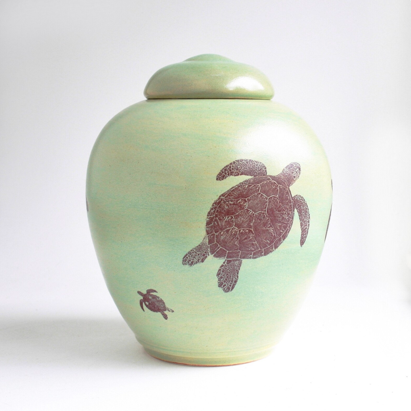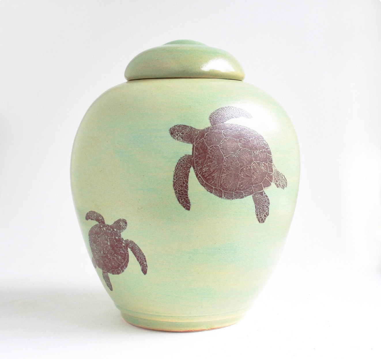 Honor the memory of a beloved ocean lover, beach enthusiast, or nature lover with this beautifully crafted adult ceramic cremation urn. Featuring six sepia-toned sea turtles in varying sizes gracefully swimming across a warm yellow-green background, this memorial urn captures the tranquil beauty of ocean life.