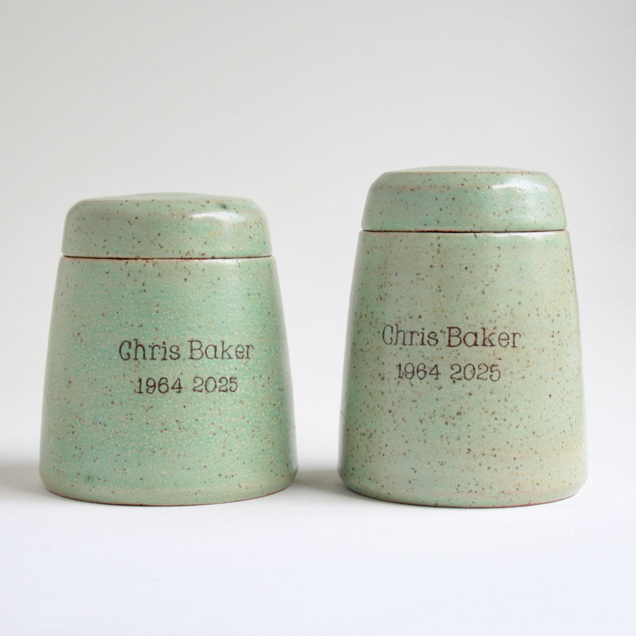 Two handmade keepsake urns with satin green glaze and decal customization. Made with love for Chris. Thank you Ashley 💚