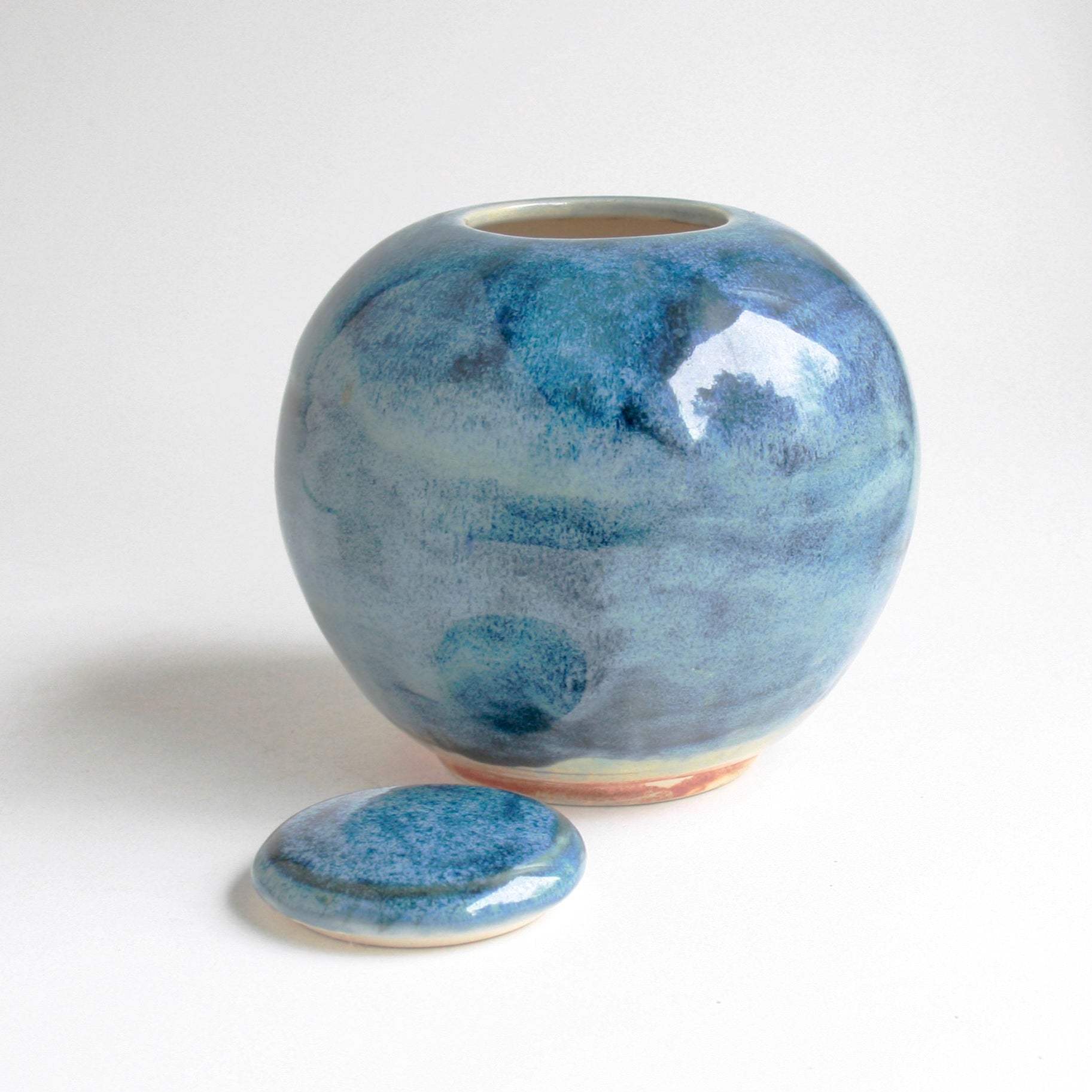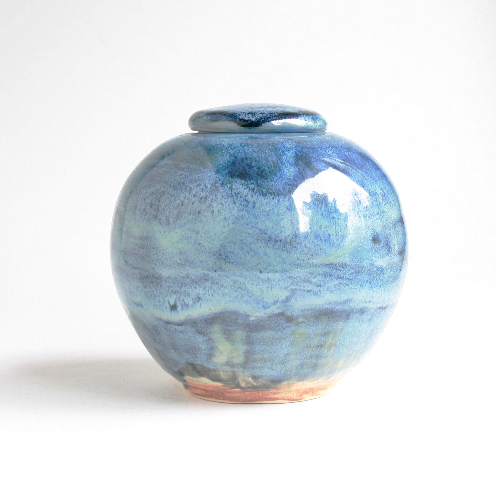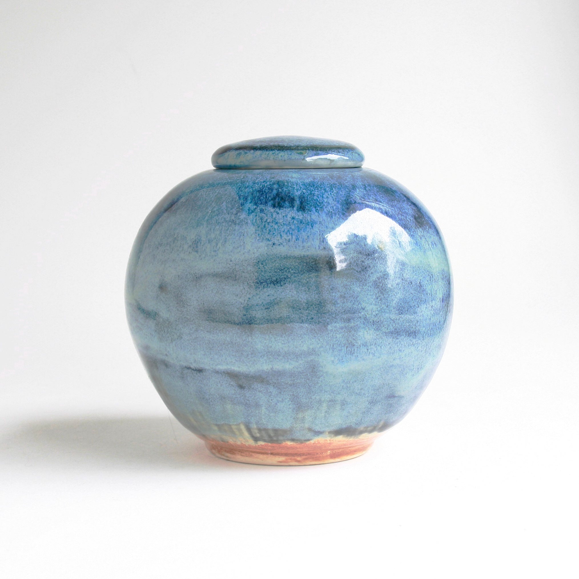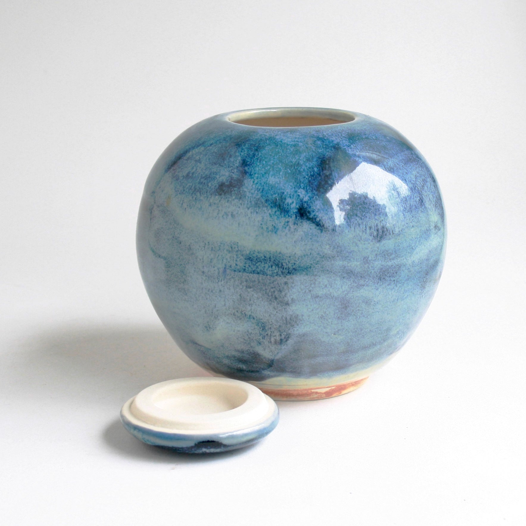 The perfectly round shape of this urn is accented with flowing, multi-tonal blue glaze that ripples across the surface in shades ranging from soft sky blue to deep ocean navy. Because this unique finish is achieved through multiple kiln firings, it cannot be replicated — making it a truly one-of-a-kind memorial keepsake.