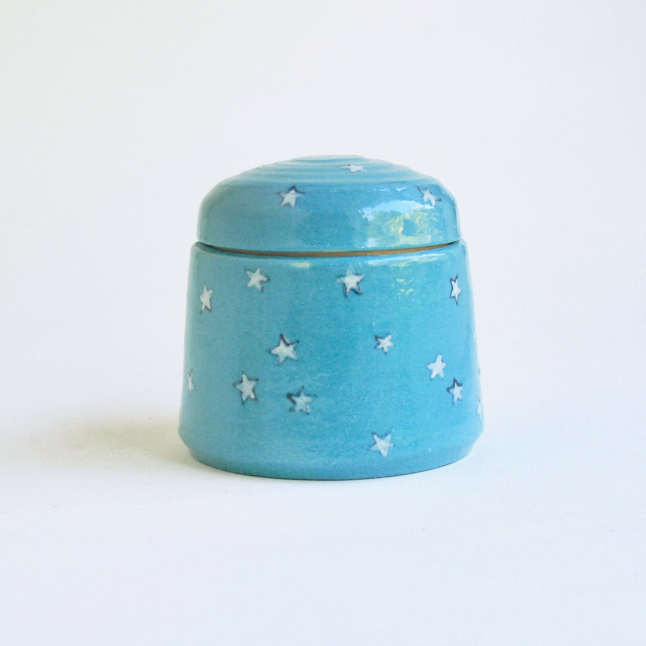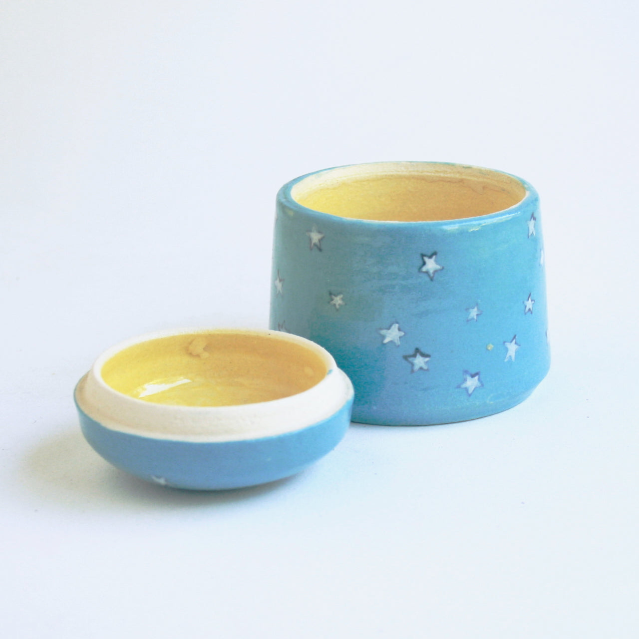 This cheerful little urn was handmade and meticulously painted by us and is the perfect size for a baby or small pet. White stars float on a turquoise background, and the inside is painted yellow. It will bring a bright spot to any home in remembrance of your beloved child or pet.
